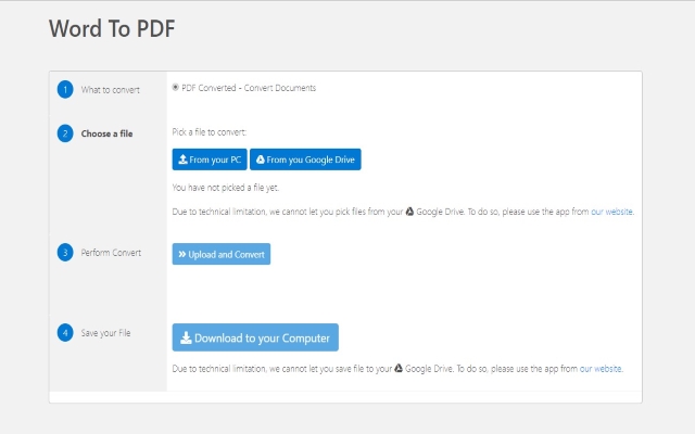 - You dont need to register to begin converting Word to PDF. Our extension supports Word conversion to PDF - Convert as many files as you want - Save your output files to either your computer/Google Drive Convert your word documents to PDF now and save it to either your local computer/Google Drive. This word to PDF converter service is 100% free. Try it now